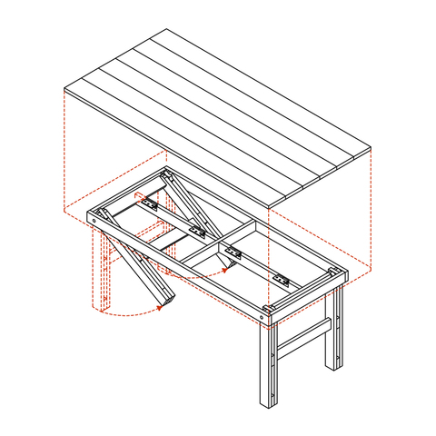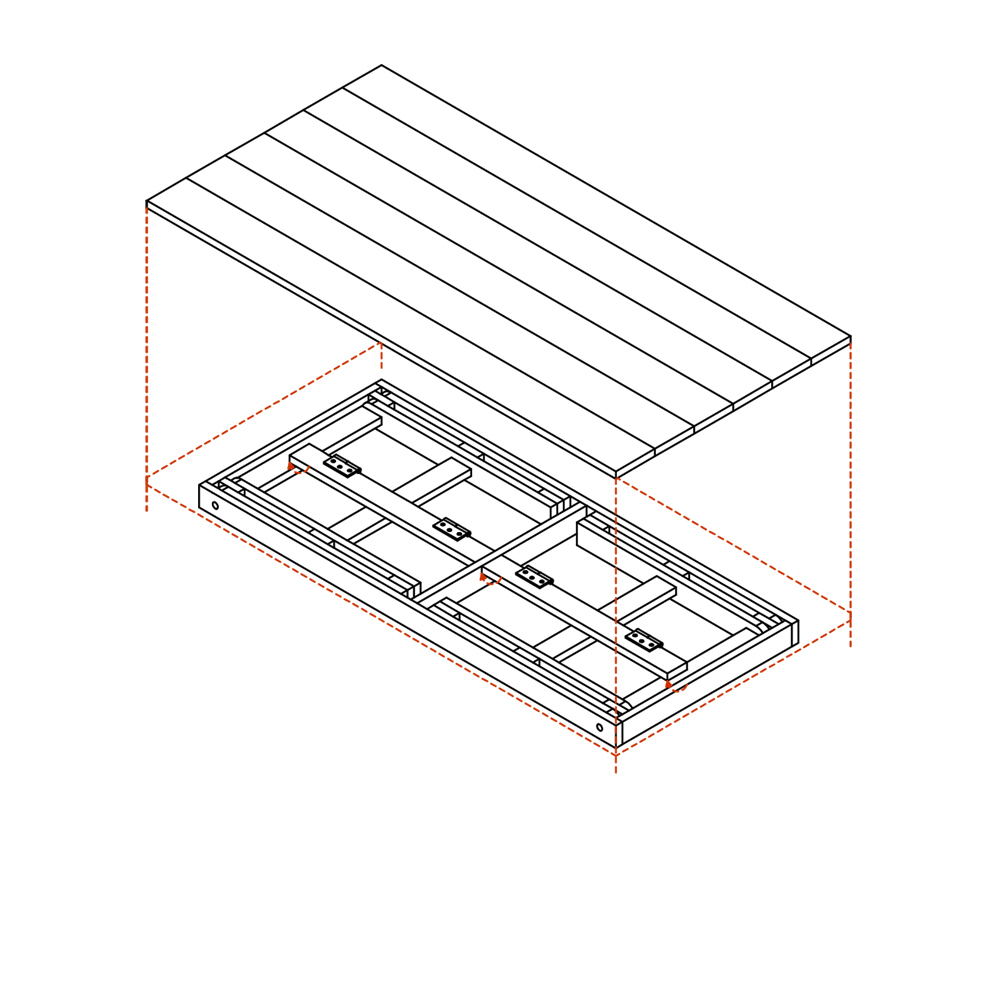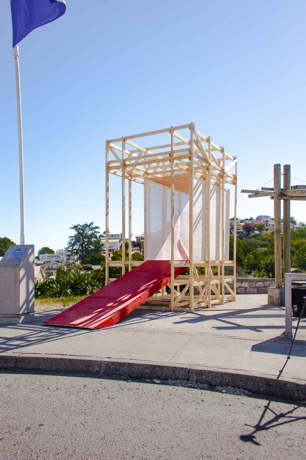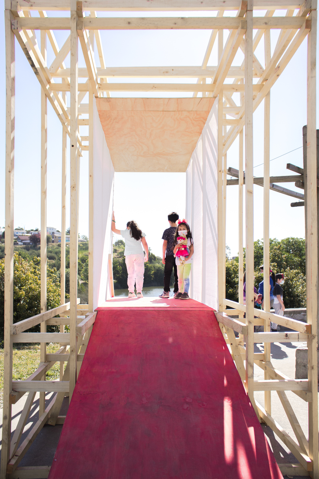 La estructura se compone por un entramado de vigas y pilares en orientación vertical, siguiendo la morfología alargada de los árboles que bordean la laguna, mientras que el brazo se forma a partir de tableros de madera pintados de rojo, utilizando el color para generar una tensión potente entre el espacio público y el artefacto. El cuadro que enmarca la vista vertical de la laguna está revestida en malla raschel blanca, material que puede ser reutilizado de obras de construcción, y que permite configuran un espacio cerrado pero en conexión con el medio.